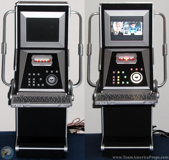 This is a pretty cool prop... This is the Medical Console from Team Base. it's a completely custom built device that is a very elaborate background prop. It's first seen in the operating room when Gary is being turned into a terrorist spy. But it's seen more prominently during the 'Montage' scene when Gary is lifting weights. It has a fully functioning video display built into it, as well as a series of flashing LED lights, another group of colored lights (and the large round thing that lights up), and a real computer keyboard (from a Sharp PDA device of some kind, and is not connected to anything). The entire body is made out of plastic sheets glued together and it has aluminum 'handles' on either side. As you can see, it still works 100% (and it's even playing the scene